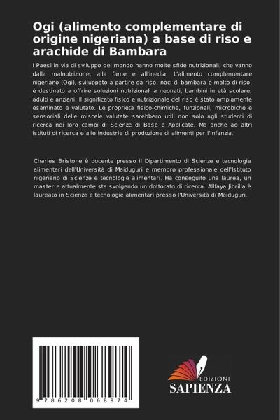 I Paesi in via di sviluppo del mondo hanno molte sfide nutrizionali, che vanno dalla malnutrizione, alla fame e all'inedia. L'alimento complementare nigeriano (Ogi), sviluppato a partire da riso, noci di bambara e malto di riso, è destinato a offrire soluzioni nutrizionali a neonati, bambini in età scolare, adulti e anziani. Il significato fisico e nutrizionale del riso è stato ampiamente esaminato e valutato. Le proprietà fisico-chimiche, funzionali, microbiche e sensoriali delle miscele valutate sarebbero utili non solo agli studenti di ricerca nei loro campi di Scienze di Base e Applicate. Ma anche ad altri istituti di ricerca e alle industrie di produzione di alimenti per l'infanzia.