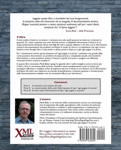 Il web cambia il modo in cui usiamo i contenuti, non solo quelli presenti sul web, ma i contenuti in generale. Se i vostri contenuti non sono facili da trovare e utilizzabili velocemente, il lettore se ne andrà praticamente all'istante. Siamo tutti figli del web e, quando abbiamo a che fare con le informazioni, inclusa la documentazione dei prodotti, cerchiamo il campo di ricerca e ci aspettiamo che ogni ricerca funzioni come Google. Non c'è più primo o ultimo, prima o dopo, su o giù: ogni pagina è la prima. Per i comunicatori tecnici, questa situazione di "ogni pagina è la prima" costituisce una grande sfida: come possiamo documentare un prodotto di ampia portata e complessità usando solo moduli di informazione, e come possiamo mettere il lettore in grado di trovare e navigare con efficienza contenuti scritti in maniera modulare? In questo libro innovativo, Mark Baker spinge lo sguardo oltre i soliti consigli su come scrivere per il web e oltre la concezione della scrittura modulare intesa semplicemente come un mezzo per perseguire efficienza e riutilizzo, al fine di esplorare dal vero il modo in cui il lettore usa le informazioni nell'epoca del web e per elaborare un metodo di pianificazione, creazione, gestione e strutturazione della documentazione modulare che sia veramente efficace per tale lettore.
