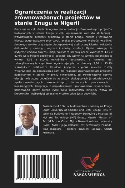 Praca ma na celu zbadanie ogranicze¿ w realizacji zrównowäonych projektów budowlanych w stanie Enugu w celu opracowania ram dla skutecznej i zrównowäonej realizacji projektów w stanie Enugu. Analiz¿ i testowanie hipotez przeprowadzono przy u¿yciu analizy procentowej wielko¿ci wspólnej, ¿redniego wyniku przy u¿yciu pi¿ciopunktowej skali oceny Likerta, wskänika dotkliwo¿ci / rankingu, regresji i analizy korelacji. Wyniki pokazuj¿, ¿e krytyczne czynniki sukcesu maj¿ najwy¿sz¿ ¿redni¿ ocen¿ wynosz¿c¿ 4,15 z 82,9% wskänikiem dotkliwo¿ci, podczas gdy wp¿yw na czynniki ograniczaj¿ce wynosi 4,02 z 80,4% wskänikiem dotkliwo¿ci, a najmniej jest zidentyfikowanych czynników ograniczaj¿cych ze ¿redni¿ 3,70 i 73,9% wskänikiem dotkliwo¿ci. Ustalone krytyczne czynniki sukcesu zostäy wykorzystane do opracowania ram dla realizacji zrównowäonych projektów budowlanych w stanie. W pracy stwierdzono, ¿e zrównowäone budynki oferuj¿ holistyczne podej¿cie do aspektów ekologicznych (¿rodowiskowych), spo¿eczno-kulturowych, ekonomicznych, technicznych, procesowych i lokalizacyjnych. Integracja z projektowaniem, planowaniem, wykonaniem i konserwacj¿ oceny cäego cyklu ¿ycia zapewni¿aby mniejszy wp¿yw na ¿rodowisko i najbardziej op¿acalne w cäym cyklu ¿ycia budynków.