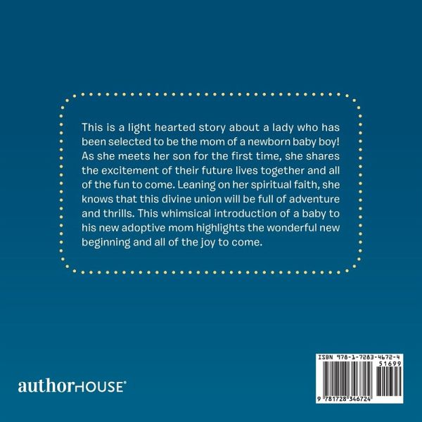 This is a light hearted story about a lady who has been selected to be the mom of a newborn baby boy! As she meets her son for the first time, she shares the excitement of their future lives together and all of the fun to come. Leaning on her spiritual faith, she knows that this divine union will be full of adventure and thrills. This whimsical introduction of a baby to his new adoptive mom highlights the wonderful new beginning and all of the joy to come.