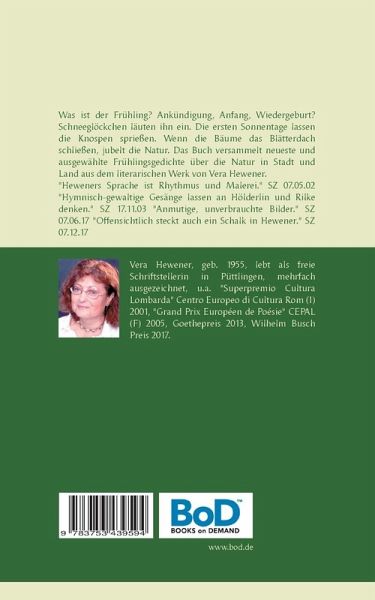 Was ist der Frühling? Ankündigung, Wiedergeburt? Schneeglöckchen läuten ihn ein. Die ersten Sonnentage lassen die Knospen sprießen. Wenn die Bäume das Blätterdach schließen, jubelt die Natur. Das Buch versammelt neueste und ausgesuchte Frühlingsgedichte über die Natur in Stadt und Land von Vera Hewener.Heweners Sprache ist Rhythmus und Malerei. Beatrix Hoffmann, SZ 07.05.02. Hymnisch-gewaltige Gesänge lassen an Hölderlin und Rilke denken. Jürgen Kück, SZ 17.11.03. Anmutige, unverbrauchte Bilder. Ruth Rousselange, SZ 07.06.17