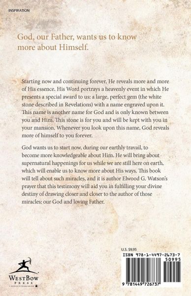 God, our Father, wants us to know more about Himself. Starting now and continuing forever, He reveals more and more of His essence. His Word portrays a heavenly event in which He presents a special award to us: a large, perfect gem (the white stone described in Revelations) with a name engraved upon it. This name is another name for God and is only known between you and Him. This stone is for you and will be kept with you in your mansion. Whenever you look upon this name, God reveals more of himself to you forever. God wants us to start now, during our earthly travail, to become more knowledgeable about Him. He will bring about supernatural happenings for us while we are still here on earth, which will enable us to know more about His ways. This book will tell about such miracles, and it is author Elwood G. Watson’s prayer that this testimony will aid you in fulfilling your divine destiny of drawing closer and closer to the author of those miracles: our God and loving Father.