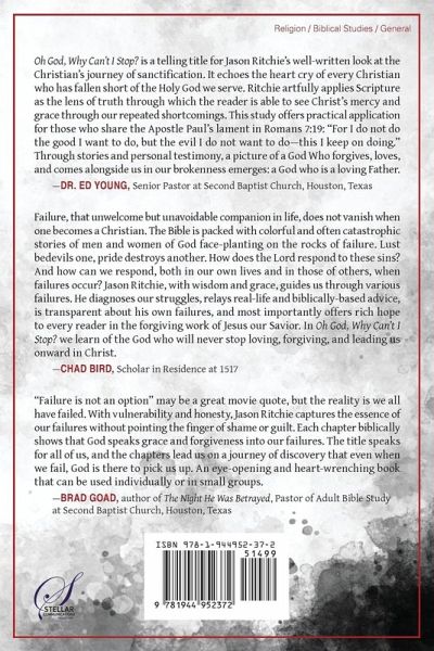 Are You Sick and Tired of Failing? It's frustrating to fail against the sin of this world. It's even worse failing against temptation, fear, and faithlessness as a believer in Christ. You're not alone. Jason Ritchie never felt so "not right" with God as during his biggest failure. He cried out in distress, "Oh God, why can't I stop failing? I can't seem to stop. Though I pray, though I study, though I return to You, I still sin, and I don't want to." In the aftermath, he wondered: "Will You still keep me? Will You still love me? Will You still use me?" What does God say to these questions? "Echoes the heart cry of every Christian who has fallen short of the Holy God we serve. Ritchie artfully applies Scripture as the lens of truth through which the reader is able to see Christ's mercy and grace through our repeated shortcomings." - Dr. Ed Young, Senior Pastor at Second Baptist Church, Houston, Texas Discover God's fundamental response to failure. Oh God, Why Can't I Stop? examines God's fundamental response to failure through the story of Peter's denial of Christ. It explores the Apostle Paul's lament in Romans 7:19: "For I do not do the good I want to do, but the evil I do not want to do-this I keep on doing." This Bible study examines the failures of some of the greatest people in God's family - and eight ways in which many of us fail today: Falling into Depression Hating Judging Others Holding On to Bitterness Lusting Giving In to Gluttony Saying Things I Shouldn't Being Prideful "Guides us with wisdom and grace through various failures. Jason Ritchie diagnoses our struggles, relays real-life and biblically-based advice, is transparent about his own failures, and most importantly offers rich hope to every reader in the forgiving work of Jesus our Savior." - Chad Bird, Scholar in Residence at 1517 Study individually or as a Bible study group. Each chapter concludes with Reflection questions to consider by yourself or as a Bible study group. You'll find out how God responded in each situation - and what it means for us today. "Captures the essence of our failures without pointing the finger of shame or guilt. . . . An eye-opening and heart-wrenching book that can be used individually or in small groups." - Brad Goad, author of The Night He Was Betrayed, Pastor of Adult Bible Study at Second Baptist Church, Houston, Texas It's time to stand on God's Word and move forward. Find out how God's response to failure conquers shame and paves your way to victory.