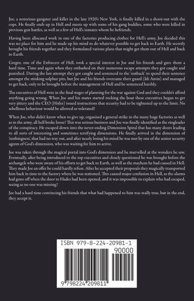 Joe, a notorious gangster and killer in the late 1920's New York, is finally killed in a shoot-out with the cops. He finally ends up in Hell and meets up with some of his gang buddies, some who were killed in previous gun battles, as well as a few of Hell's inmates whom he befriends. Having been allocated work in one of the factories producing clothes for Hell's army, Joe decided this was no place for him and he made up his mind to do whatever possible to get back to Earth. He secretly brought his friends together and they formulated various plans that might get them out of Hell and back to Earth. Gregor, one of the Enforcers of Hell, took a special interest in Joe and his friends and gave them a hard time. Time and again when they embarked on their numerous escape attempts they got caught and punished. During the last attempt they got caught and sentenced to the 'outback' to spend their sentence amongst the stinking sulphur pits, but Joe and his friends overcame their guard (Idi Amin) and managed to get back, only to be brought before the management of Hell and be sentenced harshly. The executives of Hell were in the final stages of planning for the war against God and they couldn't afford anything going wrong. When Joe and his mates started rocking the boat these executives began to get very jittery and the CEO (Hitler) issued instructions that security had to be tightened up to the limit. No rebellious behaviour would be allowed or tolerated! When Joe, who didn't know when to give up, organised a general strike in the many huge factories as well as in the army, all hell broke loose! This was serious business and Joe was finally identified as the ringleader of the conspiracy. He escaped down into the never-ending Dimension Spiral that has many doors leading to all sorts of interesting and sometimes terrifying dimensions. He finally arrived in the dimension of 'nothingness', that had no way out, and after nearly losing his mind he was met by one of the senior security agents of God's dimension, who was waiting for him to arrive. Joe was taken through the magical portal into God's dimension and he marvelled at the wonders he saw. Eventually, after being introduced to the top executives and closely questioned he was brought before the archangels who were aware of his efforts to get back to Earth, as well as the mayhem he had caused in Hell. They made Joe an offer he could hardly refuse. After he accepted their proposals they magically transported him back in time to the factory where he was stationed. This caused major confusion in Hell, as the alarms had gone off when the door to Hades had been opened, and it was impossible to explain who had escaped, seeing as no one was missing! Joe had a hard time convincing his friends that what had happened to him was really true, but in the end, they accept it.