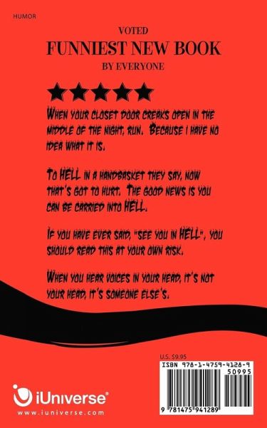 VOTED FUNNIEST NEW BOOK BY EVERYONE WHEN YOUR CLOSET DOOR CREAKS OPEN IN THE MIDDLE OF THE NIGHT, RUN. BECAUSE I HAVE NO IDEA WHAT IT IS TO HELL IN A HAND BASKET THEY SAY, NOW THAT'S GOT TO HURT. THE GOOD NEWS IS YOU CAN BE CARRIED INTO HELL. IF YOU HAVE EVER SAID, "SEE YOU IN HELL" YOU SHOULD READ THIS AT YOUR OWN RISK. WHEN YOU HEAR VOICES IN YOUR HEAD, IT'S NOT YOUR HEAD, IT'S SOMEONE ELSE'S.