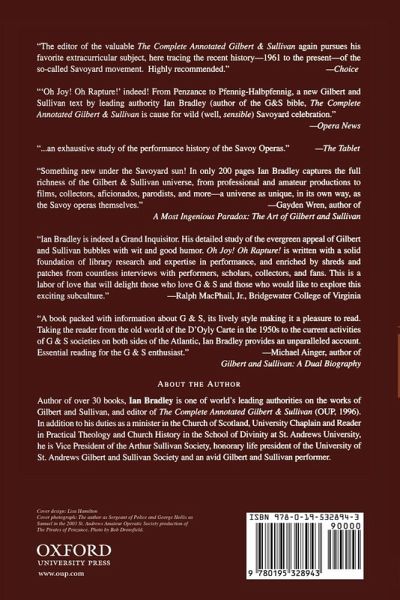 In Oh Joy! Oh Rapture! expert and enthusiast Ian Bradley explores the world of Gilbert and Sullivan over the last four and a half decades, looking at the way this "phenomenon" is passed from generation to generation. Taking as his starting point the expiry of copyright on the opera libretti at the end of 1961 and using fascinating hitherto unpublished archive material, Bradley reveals the extraordinary story of the last years of the old D'Oyly Carte Opera Company, the guardian of Savoy tradition for over a hundred years, and the troubled history of its successor. He explores the rich vein of parodies, spoofs, and spin-offs of the songs, as well as their influence on twentieth century lyricists and composers. He analyzes professional productions across the world, looks at the unique place of G&S in schools, colleges, and universities, and lovingly explores the culture of amateur performance. He also uncovers the largely male world of the obsessive fans, those collecting memorabilia, the myriad magazines, journals, websites, and festivals devoted to G&S, and the arcane interests of some of the faithful "inner brotherhood."