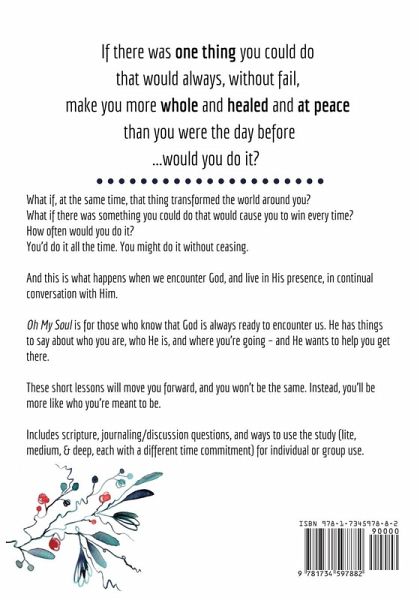 If there was one thing you could do that would always, without fail, make you more whole and healed and at peace than you were the day before, would you do it? What if, at the same time, it transformed the world around you?What if there was something you could do that would cause you to win every time - how often would you do it?You'd do it all the time. You might do it without ceasing. And this is what happens when we encounter God, and live in His presence, in continual conversation with Him. ¿Oh My Soul is for those of us who know that God is always ready to encounter us, and we want to grow through those encounters. He has things to say about who you are, who He is, and where you're going - and He wants to help you get there.These short lessons will move you forward, and you won't be the same. Instead, you'll be more like who you're meant to be. Includes scripture, journaling/discussion questions, and ways to use the study (lite, medium, & deep, each with a different time commitment) for individual or group use.