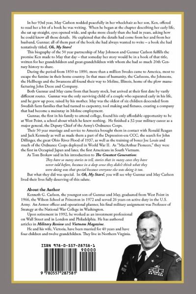 The biographies of Gunnar and May Carlson, a couple from Moline, Illinois whose military wedding included Ronald Reagan, who lived through the Depression and CCC duty, trained Joe Louis and served in World War II, were the first in Occupied Japan and among the first in Vietnam after the French departure, finishing their service to America as a general and his lady.