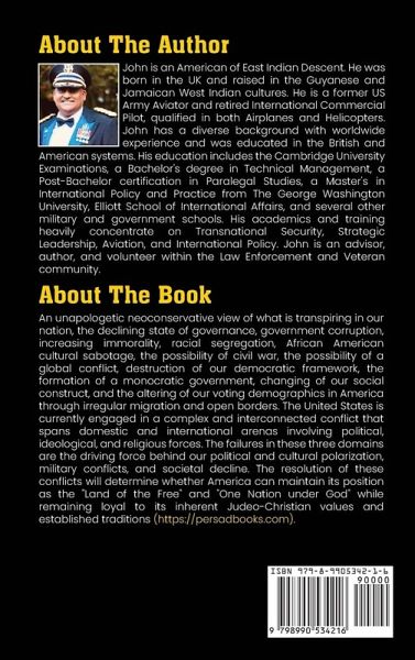 The author is of East Indian Descent, born in England to East Indian parents from Jamaica and Guyana. His father served in the Royal Air Force during WW11, his mother trained as a nurse under the Catholic diocese in Guyana and England, and later a teacher in Jamaica. John has a diverse background, is educated in the British and American systems, and has experience living in Jamaica, Guyana, Germany, America, Panama, and Türkiye. His education includes the Cambridge University Examinations (GCE "O" Level), a Bachelor's degree in Technical Management (BSTM), a post-bachelor certification as a Paralegal, a Master's in International Policy and Practice (MIPP) from The George Washington University, Elliott School of International Affairs, and numerous training to include DHS and FEMA courses. His academic tracks heavily concentrate on Transnational Security, Strategic Leadership, Aviation, and International Policy. John is a former Chief Warrant Officer (CWO3) in the United States Army Aviation Corps, a graduate of the US Army Warrant Officer Career College (Ft Rucker), US Army Aviation Flight Academy (Ft Rucker), US Army Intelligence School (Ft Huachuca), US Army Combat Readiness Center (Ft Rucker), and holds Federal Aviation Administration (FAA) certifications as a Flight Engineer (FE), Commercial Pilot (CP), and Commercial rating of Airline Transport Pilot (ATP). He is dual-rated as an aviator in Helicopters and Airplanes. He has operated as an Aviation Safety Officer-Accident Investigator, Observation Helicopter Pilot, Intelligence Airplane Pilot, Electronic Warfare Officer, and Flight Operations Officer. John has been deployed for many operations worldwide. In his last assignment, he served in Germany, the Balkans, and Türkiye, where he then changed careers and went to UPS Airlines as a commercial cargo pilot, flying the DC8, B757, and B767-300ER platforms internationally. During his civilian aviation career, John volunteered for training at the Federal Law Enforcement Training Center (FLETC) to be a Deputized Federal Aviation Law Enforcement Officer assigned under the Department of Homeland Security. John is a disabled American veteran who is extremely thankful and proud of his service to the United States Army and is currently medically retired from United Parcel Service Airlines. He brings to this book the perspective of an immigrant coming to his adopted country, embracing the nation's core values, and fully engaging in what he affectionately calls " The Land of Opportunity."John continues service today as a security and leadership consultant and volunteers as a training advisor to the Boone Police Department in NC. He also advises several foreign clients on strategic leadership, corporate security, aviation, and risk management. He is a member of the Rotary Club and the Military Officers Association of America, where he and his wife assist veterans in various capacities. John is happily retired with his wife Gerarda MSSW, LCSW, QCSW (US Army Frm., CDR. USPHS. Ret), whom he met during their early Army days of service together. John often jokes, "The Army gave me a life and issued me a wife." They have two adult children (Anthony and Omar) and a close nephew (Saheed) in their circle. His oldest son and nephew are former and retired Army, respectively. His oldest son is finishing his Project Management and MBA studies, and the youngest son has a Masters in Biomedical Science and JD. Together, John and Gerarda have five grandchildren, and when not traveling the world, they hang their hats in the beautiful North Carolina mountains, Europe, and the state of Florida.