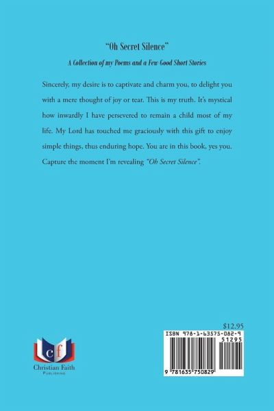Sincerely, my desire is to captivate and charm you, to delight you with a mere thought of joy or tear. This is my truth. It's mystical how inwardly I have persevered to remain a child most of my life. My Lord has touched me graciously with this gift to enjoy simple things, thus enduring hope. You are in this book, yes you. Capture the moment I'm revealing "Oh Secret Silence". William R. Koval