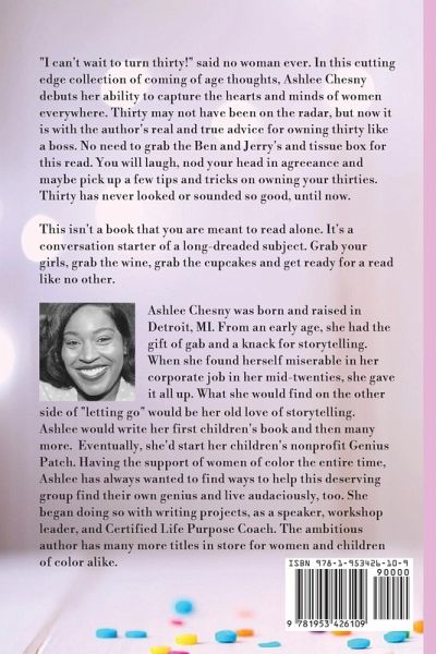 I can't wait to turn thirty!" said no woman ever. In this cutting edge collection of coming of age thoughts, Ashlee Chesny debuts her ability to capture the hearts and minds of women everywhere. Thirty may not have been on the radar, but now it is with the author's real and true advice for owning thirty like a boss. No need to grab the Ben and Jerry's and tissue box for this read. You will laugh, nod your head in agreeance and maybe pick up a few tips and tricks on owning your thirties. Thirty has never looked or sounded so good, until now. This isn't a book that you are meant to read alone. It's a conversation starter of a long-dreaded subject. Grab your girls, grab the wine, grab the cupcakes and get ready for a read like no other. Ashlee Chesny was born and raised in Detroit, MI. From an early age, she had the gift of gab and a knack for storytelling. When she found herself miserable in her corporate job in her mid-twenties, she gave it all up. What she would find on the other side of "letting go" would be her old love of storytelling. Ashlee would write her first children's book and then many more. Eventually, she'd start her children's nonprofit Genius Patch. Having the support of women of color the entire time, Ashlee has always wanted to find ways to help this deserving group find their own genius and live audaciously, too. She began doing so with writing projects, as a speaker, workshop leader, and Certified Life Purpose Coach. The ambitious author has many more titles in store for women and children of color alike. Reviews Where do I even begin? Wait, actually I know exactly where to start! I am by no means an avid reader. To be quite honest, I don't know if there has ever been a book to actually hold my attention. Well, correction until I read yours! This book is something not only should every "30 something" year old read, but any [woman] entering into a new phase in her life. 30 + gives us experiences that no one necessarily warns us about! We hear about the purity of adolescence, we here about the importance of being young adults, and we hear about the God awful menopause! However this book, bridges that gap giving all kinds of feels! I experienced everything from "Oprah aha moments, to pure belly laughter, and even a few Amen's! This is a MUST READ! One of the many parts the resonated with me is # 4 Accept Compliments. The words, "Plus, the giver of compliment wasn't asking you to agree. They were sharing how they feel." I felt that. I can honestly go on without hesitation, but I wouldn't want to spoil all of the pleasantries the book has to offer, you would just have to read it for yourself! PS. This list belongs in COSMO -Nikki M. First off, I absolutely love the title! This book is real and raw with a touch of comedy. It just cracks me up! It's a great read that celebrates womanhood and encourages empowerment. It also teaches you to loosen up and enjoy life! There is a break in the middle that allows you to reflect before you read the next half. It's a pretty dope read! I encourage all women to read this rather you're approaching 30 or you've already passed it! Get the book!! -LaShawnda D.