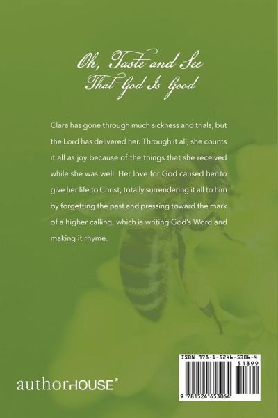 The reason I wrote this book, Oh, Taste and See That God is Good, is because I've already tasted the goodness of the Lord, and he is who he says that he is-an awesome, mighty, loving, and powerful Savior. I'm just overwhelmed by his love and the effect that he has on people who have tasted of his goodness. To me, his Word is like a beautiful song or symphony played by an orchestra. That is why I can put it to poetry and make it rhyme so sweetly. I thank the Lord for using me to do the work that he has chosen me to do.