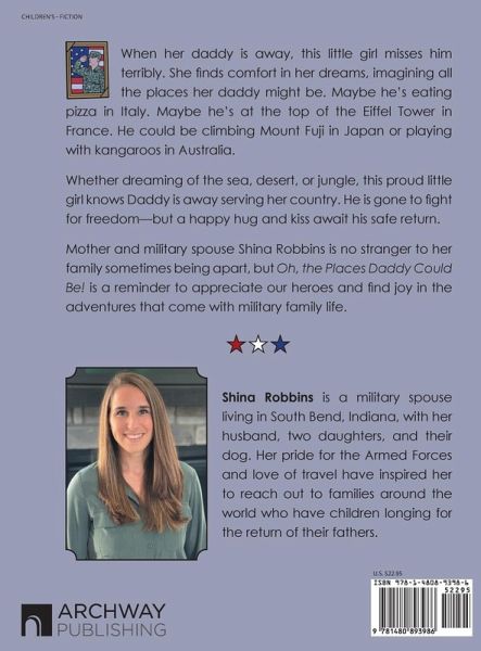 When her daddy is away, this little girl misses him terribly. She finds comfort in her dreams, imagining all the places her daddy might be. Maybe he's eating pizza in Italy. Maybe he's at the top of the Eiffel Tower in France. He could be climbing Mount Fuji in Japan or playing with kangaroos in Australia. Whether dreaming of the sea, desert, or jungle, this proud little girl knows Daddy is away serving her country. He is gone to fight for freedom-but a happy hug and kiss await his safe return. Mother and military spouse Shina Robbins is no stranger to her family sometimes being apart, but Oh, the Places Daddy Could Be! is a reminder to appreciate our heroes and find joy in the adventures that come with military family life.