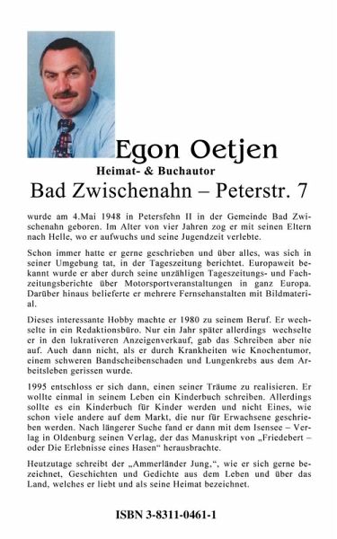 Schönste tiefgründige wie auch lustige Lyrik findet der Leser in dem neuen Gedichtband "Oh, watt¿n Gedicht" des Zwischenahner Buchautoren Egon Oetjen. 123 Seiten voller Gedichte wie "Meine Oma", "Oma Knackbusch", "Stille" und "Wasserspiele" gehören einfach in jeden Bücherschrank. Auf zwei Gedichte in diesem Buch legt der Autor aber besonderen Wert. Mit "Der alte Mann" und "Schande" schrieb er sich die Wut und Frust über die Verbrechen an Kim Kerkow, Ulrike "Nelly" Nytsch und Christina Everts von der Seele.