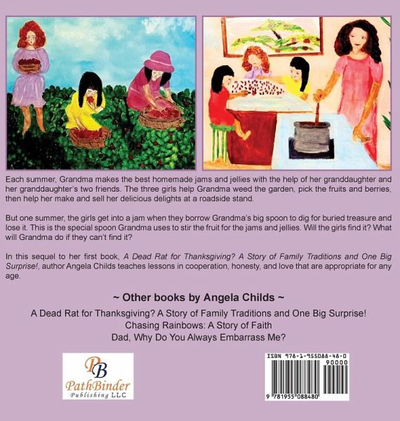 Each summer, Grandma makes the best homemade jams and jellies with the help of her granddaughter and her granddaughter's two friends. The three girls help Grandma weed the garden, pick the fruits and berries, then help her make and sell her delicious delights at a roadside stand. But one summer, the girls get into a jam when they borrow Grandma's big spoon to dig for buried treasure and lose it. This is the special spoon Grandma uses to stir the fruit for the jams and jellies. Will the girls find it? What will Grandma do if they can't find it? In this sequel to her first book, A Dead Rat for Thanksgiving? A Story of Family Traditions and One Big Surprise!, author Angela Childs teaches lessons in cooperation, honesty, and love that are appropriate for any age.
