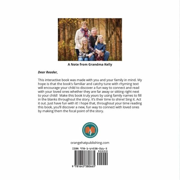 Dear Reader, This interactive book was made with you and your family in mind. My hope is that the book’s familiar and catchy tune with rhyming text will encourage your child to discover a fun way to connect and read with your loved ones whether they are far away or sitting right next to your child! Make this book truly yours by using family names to fill in the blanks throughout the story. It’s their time to shine! Sing it. Act it out. Just have fun with it! I hope that, throughout your time reading this book, you’ll discover a new, fun way to connect with loved ones by making them the focal point of the story.