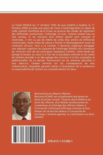 Le Traité OHADA du 17 Octobre 1993 tel que modifié à Québec le 17 Octobre 2008 accorde une place de choix à l'arbitrage.Mais en dépit de cette volonté manifeste de le hisser au pinacle des modes de règlement des différends contractuels, l'arbitrage, et avec, l'arbitre restent peu ou mal connus. Si les missions d'un arbitre sportif sont connues et maitrisées, il n'en va pas de même de celles d'un arbitre de différends contractuels, toute chose de nature à freiner le développement voulu du continent africain. Face à ce constat, il devenait impérieux d'engager une odyssée cognitive au royaume de l'arbitrage OHADA afin d'analyser les missions d'un de ses principaux "seigneurs",l'arbitre. Cette étude qui plonge le lecteur au c ur à la fois de la procédure arbitrale et du statut de l'arbitre procède à un décryptage des missions à la fois originelles et additionnelles de ce dernier. Poursuivant sur les entraves possibles à leur exercice, l'auteur termine sur les conséquences de leur inobservation, lesquelles peuvent mener à l'annulation de la sentence,à la responsabilité de l'arbitre ou cumulativement les deux.