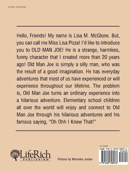 Hello, Friends! My name is Lisa M. McGlone. But, you can call me Miss Lisa Pizza! I'd like to introduce you to OLD MAN JOE! He is a strange, harmless, funny character that I created more than 20 years ago! Old Man Joe is simply a silly man, who was the result of a good imagination. He has everyday adventures that most of us have experienced or will experience throughout our lifetime. The problem is, Old Man Joe turns an ordinary experience into a hilarious adventure. Elementary school children all over the world will enjoy and connect to Old Man Joe through his hilarious adventures and his famous saying, "Oh Ohh I Knew That!"