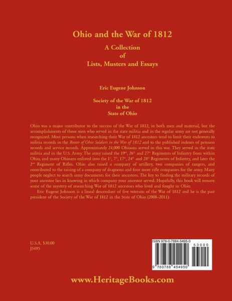 Ohio was a major contributor to the success of the War of 1812, in both men and material, but the accomplishments of those men who served in the state militia and in the regular army are not generally recognized. Most persons when researching their War of 1812 ancestors tend to limit their endeavors to militia records in the Roster of Ohio Soldiers in the War of 1812 and to the published indexes of pension records and service records. Approximately 24,000 Ohioans served in this war. They served in the state militia and in the U.S. Army. The army raised the 19th, 26th and 27th Regiments of Infantry from within Ohio, and many Ohioans enlisted into the 1st, 7th, 17th, 24th and 28th Regiments of Infantry, and later the 2nd Regiment of Rifles. Ohio also raised a company of artillery, two companies of rangers, and contributed to the raising of a company of dragoons and four more rifle companies for the army. Many people neglect to search army documents for their ancestors. The key to finding the military records of your ancestor lies in knowing in which company your ancestor served. Hopefully, this book will remove some of the mystery of researching War of 1812 ancestors who lived and fought in Ohio. Eric Eugene Johnson is a lineal descendant of five veterans of the War of 1812 and he is the past president of the Society of the War of 1812 in the State of Ohio (2008-2011).