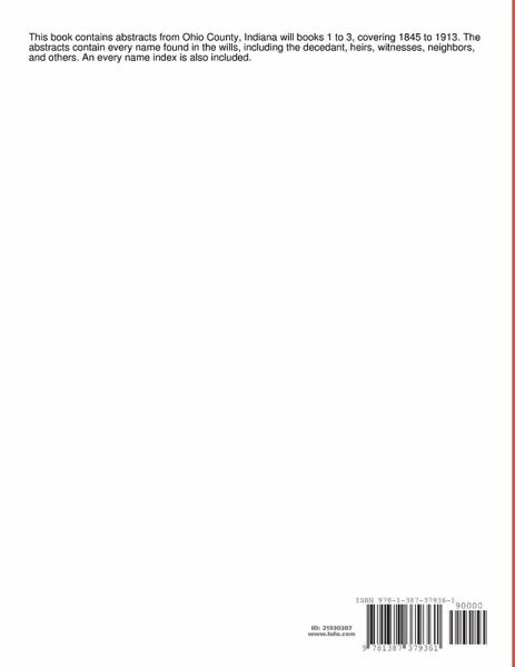 This book contains abstracts from Ohio County, Indiana will books 1 to 3, covering 1845 to 1913. The abstracts contain every name found in the wills, including the decedant, heirs, witnesses, neighbors, and others. An every name index is also included.