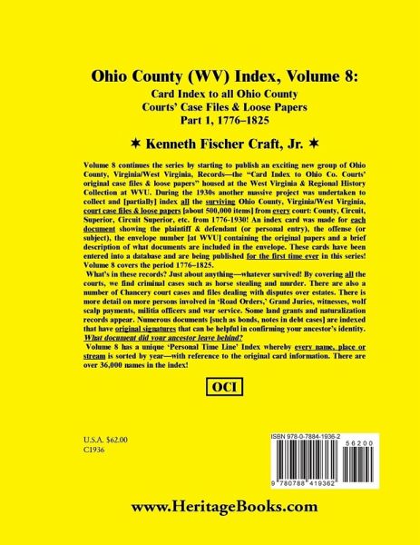 Volume 8 continues the series by starting to publish an exciting new group of Ohio County, VA/WV Records - the "Card Index to Ohio Co. Courts' original case files & loose papers" housed at the West Virginia & Regional History Collection at WVU. During the 1930's another massive project was undertaken to collect and [partially] index all the surviving Ohio Co., VA/WV court case files & loose papers [about 500,000 items] from every court: County, Circuit, Superior, Circuit Superior, etc. from 1776-1930! An index card was made for each document showing the plaintiff & defendant (or personal entry), the offense (or subject), the envelope number [at WVU] containing the original papers and a brief description of what documents are included in the envelope. These cards have been entered into a database and are being published for the first time ever in this book. Volume 8 covers the period 1776-1825. By covering all the courts, we find criminal cases such as horse stealing and murder. There are also a number of Chancery court cases & files dealing with disputes over estates. There is more detail on more persons involved in 'Road Orders', Grand Juries, Witnesses, wolf scalp payments, militia officers and war service. Some Land Grants and Naturalization records appear. Numerous documents [such as bonds, notes in debt cases] are indexed that have original signatures that can be helpful in confirming your ancestor's identity. What document did your ancestor leave behind! Original 1777 Ohio County (VA), WV covered all of the present-day counties of Ohio, Brooke, Hancock, Marshall, Wetzel and Tyler and small parts of Doddridge and Pleasants Counties. Ohio County/Wheeling were in the middle of several migration trails to the 'West', including the Ohio River, the National Road and Zane's Trace. Some migrants might have stayed for a while in Ohio County before moving 'West' and may have been caught up in these records. Searching is also made much easier by the unique 'Personal Time Line' Index whereby every name, place or stream is sorted by year - with a database of the original card information. There are over 36,000 names in the index - more names per page than any other regular OCI volume!