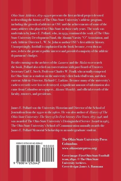 Ohio State Athletics, 1879-1959 represents the first archival project devoted to describing the history of The Ohio State University's athletic program, including the growth of athletics at OSU and the achievements of some of the many athletes who played for Ohio State in those early years. The work was undertaken by James E. Pollard, who, in 1959, continued the work of The Ohio State University Development Fund, the Alumni Varsity "O" Association, and early Athletic Director L. W. St. John to author OSU's first athletic history. Unsurprisingly, football is emphasized in the book because, even then as now, it drew the greatest public interest and provided a majority of the athletic department's budget. Besides turning to the archives of the Lantern and the Makio to research the book, Pollard also relied on conversations with past Board of Trustees Secretary Carl E. Steeb, Professor Charles W. Foulk who actually competed for Ohio State as a student on the university's first basketball team, and then current Athletic Director, Richard C. Larkins. Because many of the university's earliest records were lost or destroyed, a significant amount of information also came from Columbus newspapers, Alumni Monthly, and official records of the faculty, trustees, and presidents.