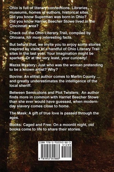 Ohio is full of literary connections. Libraries, museums, homes of authors, historical sites. Did you know Superman was born in Ohio? Did you know Harriet Beecher Stowe lived in the Cincinnati area? Check out the Ohio Literary Trail, compiled by Ohioana, for more interesting facts. But before that, we invite you to enjoy some stories inspired by visits to a handful of Ohio Literary Trail sites in the last year. Your imagination might be sparked. Or at the very least, your curiosity! Mazza Mystery: Just who was the woman pretending to be a known artist? Why? Bovine: An elitist author comes to Marlin County ... and greatly underestimates the intelligence of the local sheriff. Between Semicolons and Plot Twisters: An author finds more in common with Harriet Beecher Stowe than she ever would have guessed, when modern-day slavery comes close to home. The Mask: A gift of true love is passed through the ages. Books: Caged and Free: On a moonlit night, old books come to life to share their stories.