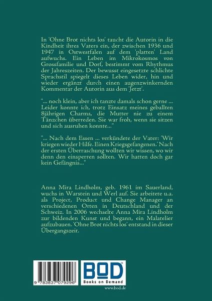 In 'Ohne Brot nichts los' taucht die Autorin in die Kindheit ihres Vaters ein, der zwischen 1936 und 1947 in Westfalen auf dem 'platten' Land aufwuchs. Ein Leben im Mikrokosmos von Grossfamilie und Dorf, bestimmt vom Rhythmus der Jahreszeiten. Der bewusst eingesetzte schlichte Sprachstil spiegelt dieses Leben wider, hin und wieder ergänzt durch einen augenzwinkernden Kommentar der Autorin aus dem 'Jetzt'.