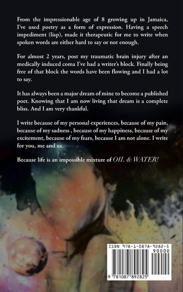 From the impressionable age of 8 yrs old, Montia Morgan used poetry as a form of expression. This book is a collection of poems written by the author, from her early teenage years through young adulthood. This is book is a unconventional mix, and what is to be expected is the unexpected. She writes because of her personal experiences, her pain, her sadness, her happiness, because of her excitement, her fears, and because she knows she is not alone. She writes for you, me and us. She writes because life is an impossible mixture of OIL & WATER!