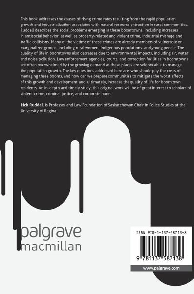 This book addresses the causes of rising crime rates resulting from the rapid population growth and industrialization associated with natural resource extraction in rural communities. Ruddell describes the social problems emerging in these boomtowns, including increases in antisocial behavior, as well as property-related and violent crime, industrial mishaps and traffic collisions. Many of the victims of these crimes are already members of vulnerable or marginalized groups, including rural women, Indigenous populations, and young people. The quality of life in boomtowns also decreases due to environmental impacts, including air, water and noise pollution. Law enforcement agencies, courts, and correction facilities in boomtowns are often overwhelmed by the growing demand as these places are seldom able to manage the population growth. The key questions addressed here are: who should pay the costs of managing these booms, and how can we prepare communities to mitigate the worst effects of this growth and development and, ultimately, increase the quality of life for boomtown residents. An in-depth and timely study, this original work will be of great interest to scholars of violent crime, criminal justice, and corporate harm.