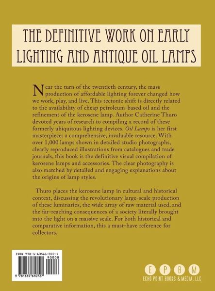 Near the turn of the twentieth century, the mass production of affordable lighting forever changed how we work, play, and live. This tectonic shift is directly related to the availability of cheap petroleum-based oil and the refinement of the kerosene lamp. Author Catherine Thuro devoted years of research to compiling a record of these formerly ubiquitous lighting devices. Oil Lamps is her first masterpiece: a comprehensive, invaluable resource. With over 1,000 lamps shown in detailed studio photographs, clearly reproduced illustrations from catalogues and trade journals, this book is the definitive visual compilation of kerosene lamps and accessories. The clear photography is also matched by detailed and engaging explanations about the origins of lamp styles. Thuro places the kerosene lamp in cultural and historical context, discussing the revolutionary large-scale production of these luminaries, the wide array of raw material used, and the far-reaching consequences of a society literally brought into the light on a massive scale. For both historical and comparative information, this a must-have reference for collectors.
