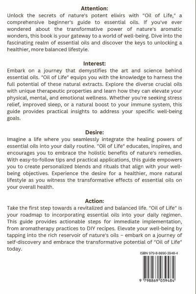 Attention: Unlock the secrets of nature's potent elixirs with "Oil of Life", a comprehensive beginner's guide to essential oils. If you've ever wondered about the transformative power of nature's aromatic wonders, this book is your gateway to a world of well- being. Dive into the fascinating realm of essential oils and discover the keys to unlocking a healthier, more balanced lifestyle. Interest: Embark on a journey that demystifies the art and science behind essential oils. "Oil of Life" equips you with the knowledge to harness the full potential of these natural extracts. Explore the diverse crucial oils with unique therapeutic properties and learn how they can elevate your physical, mental, and emotional wellness. Whether you're seeking stress relief, improved sleep, or a natural boost to your immune system, this guide provides practical insights to address your specific well-being goals. Desire: Imagine a life where you seamlessly integrate the healing powers of essential oils into your daily routine. "Oil of Life" educates, inspires, and encourages you to embrace the holistic benefits of nature's remedies. With easy-to-follow tips and practical applications, this guide empowers you to create personalized blends and rituals that align with your well- being objectives. Experience the desire for a healthier, more natural lifestyle as you witness the transformative effects of essential oils on your overall health. Action: Take the first step towards a revitalized and balanced life. "Oil of Life" is your roadmap to incorporating essential oils into your daily regimen. This guide provides actionable steps for immediate implementation, from aromatherapy practices to DIY recipes. Elevate your well-being by tapping into the rich reservoir of nature's oils - embark on a journey of self-discovery and embrace the transformative potential of "Oil of Life" today.