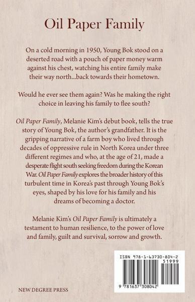 On a cold morning in 1950, Young Bok stood on a deserted road with a pouch of paper money warm against his chest, watching his entire family make their way north...back towards their hometown. Would he ever see them again? Was he making the right choice in leaving his family to flee south? Oil Paper Family, Melanie Kim's debut book, tells the true story of Young Bok, the author's grandfather. It is the gripping narrative of a farm boy who lived through decades of oppressive rule in North Korea under three different regimes and who, at the age of 21, made a desperate flight south seeking freedom during the Korean War. Oil Paper Family explores the broader history of this turbulent time in Korea's past through Young Bok's eyes, shaped by his love for his family and his dreams of becoming a doctor. Melanie Kim's Oil Paper Family is ultimately a testament to human resilience, to the power of love and family, guilt and survival, sorrow and growth.