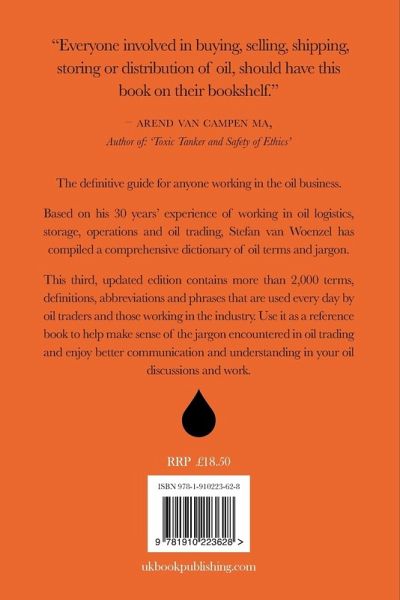 The definitive guide for anyone working in the oil business. Based on his 30 years' experience of working in oil logistics, storage, operations and oil trading, Stefan van Woenzel has compiled a comprehensive dictionary of oil terms and jargon. This third, updated edition contains more than 2,000 terms, definitions, abbreviations and phrases that are used every day by oil traders and those working in the industry. Use it as a reference book to help make sense of the jargon encountered in oil trading and enjoy better communication and understanding in your oil discussions and work. "Everyone involved in buying, selling, shipping, storing or distribution of oil, should have this book on their bookshelf." - arend van campen ma, Author of: 'Toxic Tanker and Safety of Ethics'