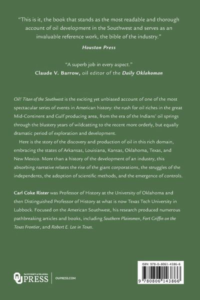 "This is it, the book that stands as the most readable and thorough account of oil development in the Southwest, and serves as an invaluable reference work, the bible of the industry." Houston Press "A superb job in every aspect." Claude V. Barrow, oil editor of the Daily Oklahoman Oil! Titan of the Southwest is the exciting yet unbiased account of one of the most spectacular series of events in American history: the rush for oil riches in the great Mid-Continent and Gulf producing area, from the era of the Indians' oil springs through the blustery years of wildcatting to the recent more orderly, but equally dramatic period of exploration and development. Here is the story of the discovery and production of oil in this rich domain, embracing the states of Arkansas, Louisiana, Kansas, Oklahoma, Texas, and New Mexico. More than a history of the development of an industry, this absorbing narrative relates the rise of the giant corporations, the struggles of the independents, the adoption of scientific methods, and the emergence of controls. Carl Coke Rister was Professor of History at the University of Oklahoma, then Distinguished Professor of History at what is now Texas Tech University in Lubbock. Focused on the American Southwest, his research produced numerous pathbreaking articles and books, including Southern Plainsmen, Fort Griffin on the Texas Frontier, and Robert E. Lee in Texas.