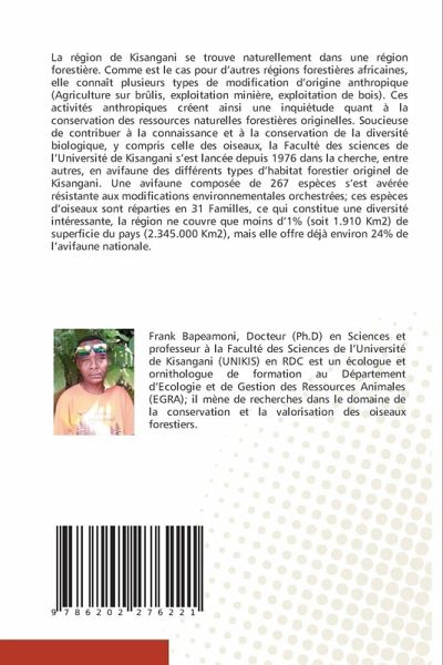 La région de Kisangani se trouve naturellement dans une région forestière. Comme est le cas pour d'autres régions forestières africaines, elle connaît plusieurs types de modification d'origine anthropique (Agriculture sur brûlis, exploitation minière, exploitation de bois). Ces activités anthropiques créent ainsi une inquiétude quant à la conservation des ressources naturelles forestières originelles. Soucieuse de contribuer à la connaissance et à la conservation de la diversité biologique, y compris celle des oiseaux, la Faculté des sciences de l'Université de Kisangani s'est lancée depuis 1976 dans la cherche, entre autres, en avifaune des différents types d'habitat forestier originel de Kisangani. Une avifaune composée de 267 espèces s'est avérée résistante aux modifications environnementales orchestrées; ces espèces d'oiseaux sont réparties en 31 Familles, ce qui constitue une diversité intéressante, la région ne couvre que moins d'1% (soit 1.910 Km2) de superficie du pays (2.345.000 Km2), mais elle offre déjà environ 24% de l'avifaune nationale.