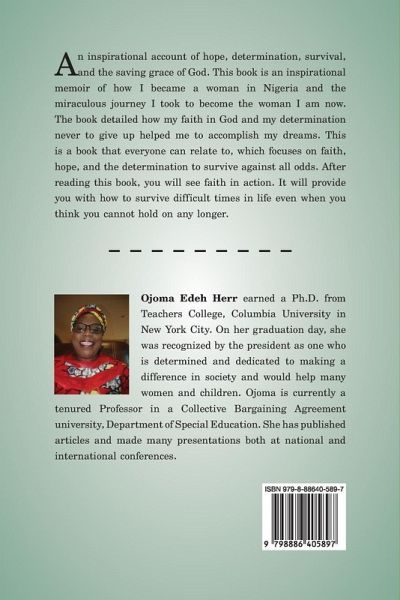 An inspirational account of hope. determination. Survival, and the saving grace of God. This book is an inspirational memoir of how I became a woman m Nigeria and the miraculous journey I took to become the woman I am now. The book detailed how my faith in God and my determination never to give up helped to accomplish my dreams. This is a book that everyone can relate to which focuses on faith, and hope. and the determination to survive against all odds. After reading this book, you will see faith in action. It will provide you with how to survive difficult times in life even when you think you cannot hold on any longer.