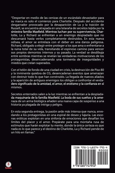 "Despertar en medio de las cenizas de un escándalo devastador para su marca es solo el comienzo para Charlotte. Después del accidente desgarrador provocado por la desaparición de Lu y la traición de Russell, se encuentra atrapada en una telaraña de secretos tejida por la siniestra familia Maxfield. Mientras luchan por su supervivencia, Charlotte, Lu y Richard se enfrentan a un enemigo despiadado que no descansará hasta verlos completamente destruidos. En esta nueva odisea, el amor se entrelaza con el deber en una danza peligrosa. Richard, obligado a elegir entre proteger a los que ama o enfrentarse a la ruina total de su vida, transitando el espinoso camino para vencer sus propios demonios internos y su pasado. La verdad se desdibuja entre sombras mientras se revelan las verdaderas motivaciones de los protagonistas, desencadenando una tormenta de inseguridades y miedos que creían superados. Con el telón de fondo de una ciudad en crisis, la destrucción de Piso 80 y la inminente quiebra de CG, desencadenan eventos que amenazan con destruir todo lo que han construido. La llegada de nuevos aliados y la aparición de antiguos enemigos los obligan a confrontar el verdadero significado de la amistad, el amor, el erotismo y la confianza en sí mismos. Secretos enterrados salen a la luz mientras se enfrentan a la despiadada maquinaria de la familia Maxfield. La boda de sus sueños y la amenaza de un arma biológica añaden una nueva capa de suspenso a una historia ya plagada de intriga y peligro. En esta segunda entrega, la pasión arde más intensa que nunca, enredando a los protagonistas en una espiral de deseo y lujuria. Las escenas eróticas explotan en una sinfonía de emociones que desafían los límites del placer y el amor. Prepárate para una montaña rusa de estímulos que harán explotar tu mente, donde la única certeza es que nada es lo que parece y el destino de Charlotte, Lu y Richard pende de un hilo en llamas."