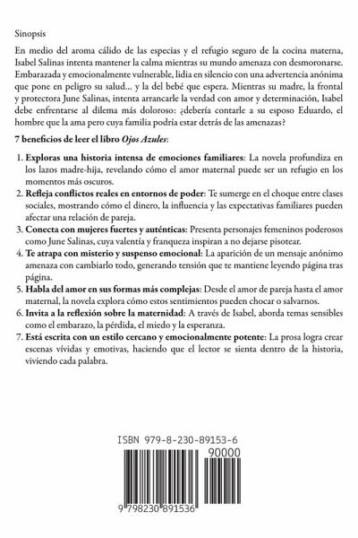 Sinopsis En medio del aroma cálido de las especias y el refugio seguro de la cocina materna, Isabel Salinas intenta mantener la calma mientras su mundo amenaza con desmoronarse. Embarazada y emocionalmente vulnerable, lidia en silencio con una advertencia anónima que pone en peligro su salud... y la del bebé que espera. Mientras su madre, la frontal y protectora June Salinas, intenta arrancarle la verdad con amor y determinación, Isabel debe enfrentarse al dilema más doloroso: ¿debería contarle a su esposo Eduardo, el hombre que la ama pero cuya familia podría estar detrás de las amenazas? 7 beneficios de leer el libro Ojos Azules:Exploras una historia intensa de emociones familiares: La novela profundiza en los lazos madre-hija, revelando cómo el amor maternal puede ser un refugio en los momentos más oscuros. Refleja conflictos reales en entornos de poder: Te sumerge en el choque entre clases sociales, mostrando cómo el dinero, la influencia y las expectativas familiares pueden afectar una relación de pareja. Conecta con mujeres fuertes y auténticas: Presenta personajes femeninos poderosos como June Salinas, cuya valentía y franqueza inspiran a no dejarse pisotear. Te atrapa con misterio y suspenso emocional: La aparición de un mensaje anónimo amenaza con cambiarlo todo, generando tensión que te mantiene leyendo página tras página. Habla del amor en sus formas más complejas: Desde el amor de pareja hasta el amor maternal, la novela explora cómo estos sentimientos pueden chocar o salvarnos. Invita a la reflexión sobre la maternidad: A través de Isabel, aborda temas sensibles como el embarazo, la pérdida, el miedo y la esperanza. Está escrita con un estilo cercano y emocionalmente potente: La prosa logra crear escenas vívidas y emotivas, haciendo que el lector se sienta dentro de la historia, viviendo cada palabra.