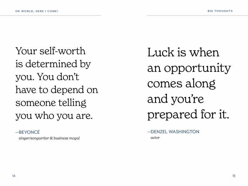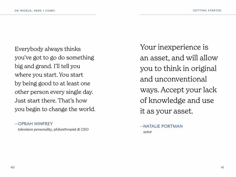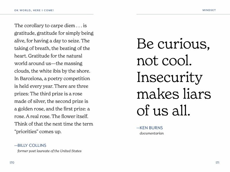 A collection of over 250 inspiring quotes and advice for graduates as they embark on a new journey, from famous commencement speakers and iconic thinkers. “When [your graduate needs] some encouragement, they can flip through the pages of this book for practical advice from some of the greats, including Maya Angelou and Jerry Seinfeld. Personalize their copy by writing an inspiring message on the inside cover.” —Yahoo!,Best Graduation Gifts for 2025 OK, World, Here I Come! is an invaluable book for graduates as they launch into the next chapter of life. Organized by themes such as Self-Care, Success & Failure, Work Ethic, and more, each quote is carefully selected to evoke confidence, motivation, and encouragement for the reader. “I’ve learned that people will forget what you said, people will forget what you did, but people will never forget how you made them feel.”—MAYA ANGELOU “Do not lose your sense of humor. You can have no idea at this point in your life how much you are going to need it to get through…. Humor is the most powerful, most survival-essential quality you will ever have or need to navigate through the human experience.”—JERRY SEINFELD [Duke 2024] “Don’t wait for good things to happen to you. If you go out and make some good things happen, you will fill the world with hope. You will fill yourself with hope.”—BARACK OBAMA “Do what you have to do that allows the most space for what you want to do.” —LIN MANUEL-MIRANDA [Hunter College 2023] “There is no stronger motivation than knowing that when you’re not practicing, someone else is.”—MICHELLE KWAN “The mind is like tofu. It tastes like whatever you marinate it in.” —Sylvia Boorstein “I love it when people doubt me. It makes me work harder to prove them wrong.” —Derek Jeter “For the most important decisions of your life, trust your intuition and then work with everything you have to prove it right.” —Tim Cook “Find out who you are and do it on purpose.” —Dolly Parton