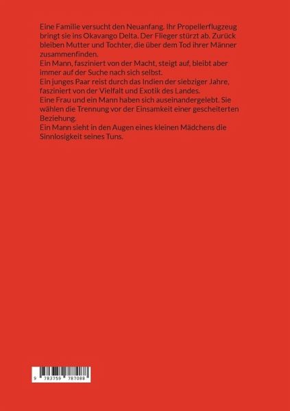 Eine Familie versucht den Neuanfang. Ihr Propellerflugzeug bringt sie ins Okavango Delta. Der Flieger stürzt ab. Zurück bleiben Mutter und Tochter, die über dem Tod ihrer Männer zusammenfinden. Ein Mann, fasziniert von der Macht, steigt auf, bleibt aber immer auf der Suche nach sich selbst. Ein junges Paar reist durch das Indien der siebziger Jahre, fasziniert von der Vielfalt und Exotik des Landes. Eine Frau und ein Mann haben sich auseinandergelebt. Sie wählen die Trennung vor der Einsamkeit einer gescheiterten Beziehung. Ein Mann sieht in den Augen eines kleinen Mädchens die Sinnlosigkeit seines Tuns.