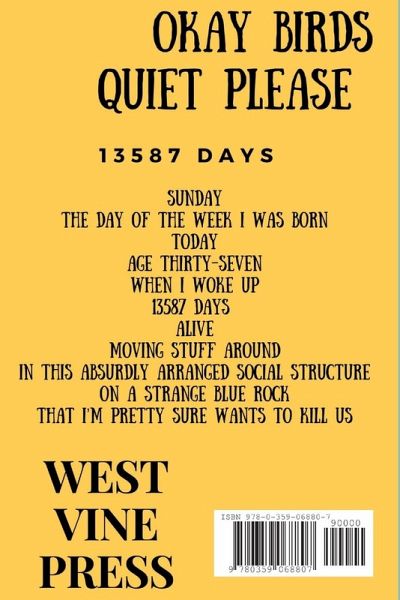 A more expensive and bigger book than the back-pocket book version. Five recently discovered pieces. Forward by Steve Shultz & afterword by Andrew K., an essay about a writer losing their writing. Okay. Birds. Quiet. Please. From the person who typed-up Poetic Poverty & SLACKER AD-NAUSEAM, okay birds quiet please is the third collection of words printed on a stack of paper that is called a book, written by Andrew K. Here we find words about the moment before the moment, about spacetime and jumping into Lake Michigan. Here is a writer not at the height of his powers, simply, doing and being and trying to figure out what any of this madness means. okay birds quiet please. It is a book, of words, from the number one selling absurdist poet. Andrew K lives a life surrounded by cats and books. Andrew K.'s future plans are as unclear as his past plans, and he told the editors he's going to move out of the United States soon, where wherever he ends up, he'll write little books of absurd poetry until the sun explodes.