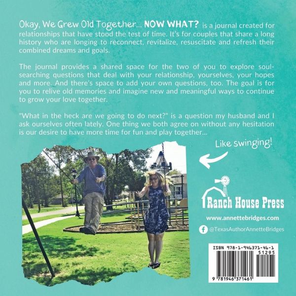 Okay, We Grew Old Together... NOW WHAT? is a journal created for relationships that have stood the test of time. It's for couples that share a long history who are longing to reconnect, revitalize, resuscitate and refresh their combined dreams and goals. The journal provides a shared space for the two of you to explore soul-searching questions that deal with your relationship, yourselves, your hopes and more. And there's space to add your own questions, too. The goal is for you to relive old memories and imagine new and meaningful ways to continue to grow your love together.