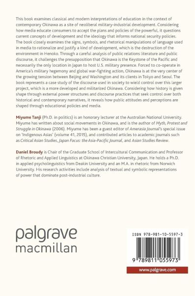 This book examines classical and modern interpretations of education in the context of contemporary Okinawa as a site of neoliberal military-industrial development. Considering how media educate consumers to accept the plans and policies of the powerful, it questions current concepts of development and the ideology that informs national security policies. The book closely examines the signs, symbols, and rhetorical manipulations of language used in media to rationalize and justify a kind of development, which is the destruction of the environment in Henoko. Through careful analysis of public relations literature and public discourse, it challenges the presupposition that Okinawa is the Keystone of the Pacific and necessarily the only location in Japan to host U.S. military presence. Forced to co-operate in America's military hegemony and global war-fighting action, Okinawa is at the very center of the growing tension between Beijing and Washington and its clients in Tokyo andSeoul.The book represents a case study of the discourse used in society to wield control over this larger project, which is a more developed and militarized Okinawa . Considering how history is given shape through external power structures and discourse practices that seek control over both historical and contemporary narratives, it reveals how public attitudes and perceptions are shaped through educational policies and media.