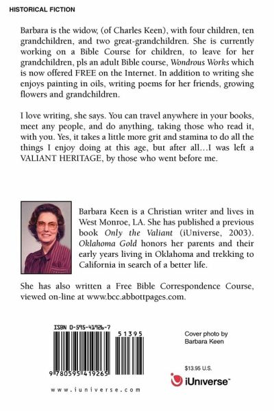 Barbara is the widow, (of Charles Keen), with four children, ten grandchildren, and two great-grandchildren. She is currently working on a Bible Course for children, to leave for her grandchildren, pls an adult Bible course, Wondrous Works which is now offered FREE on the Internet. In addition to writing she enjoys painting in oils, writing poems for her friends, growing flowers and grandchildren. I love writing, she says. You can travel anywhere in your books, meet any people, and do anything, taking those who read it, with you. Yes, it takes a little more grit and stamina to do all the things I enjoy doing at this age, but after all.I was left a VALIANT HERITAGE, by those who went before me.