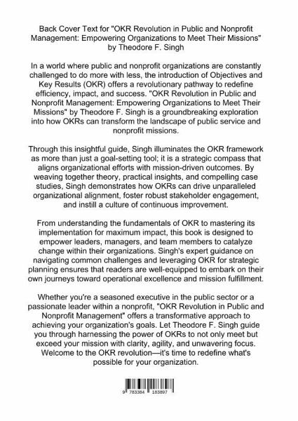 Back Cover Text for "OKR Revolution in Public and Nonprofit Management: Empowering Organizations to Meet Their Missions" by Theodore F. SinghIn a world where public and nonprofit organizations are constantly challenged to do more with less, the introduction of Objectives and Key Results (OKR) offers a revolutionary pathway to redefine efficiency, impact, and success. "OKR Revolution in Public and Nonprofit Management: Empowering Organizations to Meet Their Missions" by Theodore F. Singh is a groundbreaking exploration into how OKRs can transform the landscape of public service and nonprofit missions.Through this insightful guide, Singh illuminates the OKR framework as more than just a goal-setting tool; it is a strategic compass that aligns organizational efforts with mission-driven outcomes. By weaving together theory, practical insights, and compelling case studies, Singh demonstrates how OKRs can drive unparalleled organizational alignment, foster robust stakeholder engagement, and instill a culture of continuous improvement.From understanding the fundamentals of OKR to mastering its implementation for maximum impact, this book is designed to empower leaders, managers, and team members to catalyze change within their organizations. Singh's expert guidance on navigating common challenges and leveraging OKR for strategic planning ensures that readers are well-equipped to embark on their own journeys toward operational excellence and mission fulfillment.Whether you're a seasoned executive in the public sector or a passionate leader within a nonprofit, "OKR Revolution in Public and Nonprofit Management" offers a transformative approach to achieving your organization's goals. Let Theodore F. Singh guide you through harnessing the power of OKRs to not only meet but exceed your mission with clarity, agility, and unwavering focus. Welcome to the OKR revolution-it's time to redefine what's possible for your organization.