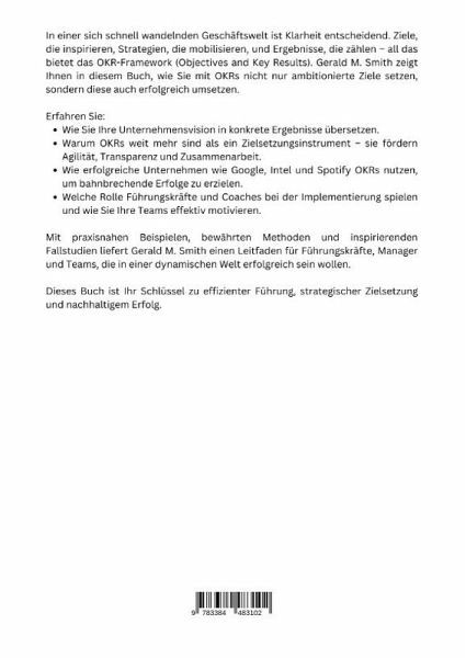 In einer sich schnell wandelnden Geschäftswelt ist Klarheit entscheidend. Ziele, die inspirieren, Strategien, die mobilisieren, und Ergebnisse, die zählen - all das bietet das OKR-Framework (Objectives and Key Results). Gerald M. Smith zeigt Ihnen in diesem Buch, wie Sie mit OKRs nicht nur ambitionierte Ziele setzen, sondern diese auch erfolgreich umsetzen.Erfahren Sie:Wie Sie Ihre Unternehmensvision in konkrete Ergebnisse übersetzen.Warum OKRs weit mehr sind als ein Zielsetzungsinstrument - sie fördern Agilität, Transparenz und Zusammenarbeit.Wie erfolgreiche Unternehmen wie Google, Intel und Spotify OKRs nutzen, um bahnbrechende Erfolge zu erzielen.Welche Rolle Führungskräfte und Coaches bei der Implementierung spielen und wie Sie Ihre Teams effektiv motivieren.Mit praxisnahen Beispielen, bewährten Methoden und inspirierenden Fallstudien liefert Gerald M. Smith einen Leitfaden für Führungskräfte, Manager und Teams, die in einer dynamischen Welt erfolgreich sein wollen.Dieses Buch ist Ihr Schlüssel zu effizienter Führung, strategischer Zielsetzung und nach-haltigem Erfolg.