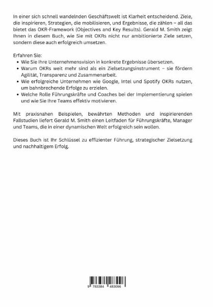 In einer sich schnell wandelnden Geschäftswelt ist Klarheit entscheidend. Ziele, die inspirieren, Strategien, die mobilisieren, und Ergebnisse, die zählen - all das bietet das OKR-Framework (Objectives and Key Results). Gerald M. Smith zeigt Ihnen in diesem Buch, wie Sie mit OKRs nicht nur ambitionierte Ziele setzen, sondern diese auch erfolgreich umsetzen.Erfahren Sie:Wie Sie Ihre Unternehmensvision in konkrete Ergebnisse übersetzen.Warum OKRs weit mehr sind als ein Zielsetzungsinstrument - sie fördern Agilität, Transparenz und Zusammenarbeit.Wie erfolgreiche Unternehmen wie Google, Intel und Spotify OKRs nutzen, um bahnbrechende Erfolge zu erzielen.Welche Rolle Führungskräfte und Coaches bei der Implementierung spielen und wie Sie Ihre Teams effektiv motivieren.Mit praxisnahen Beispielen, bewährten Methoden und inspirierenden Fallstudien liefert Gerald M. Smith einen Leitfaden für Führungskräfte, Manager und Teams, die in einer dynamischen Welt erfolgreich sein wollen.Dieses Buch ist Ihr Schlüssel zu effizienter Führung, strategischer Zielsetzung und nach-haltigem Erfolg.