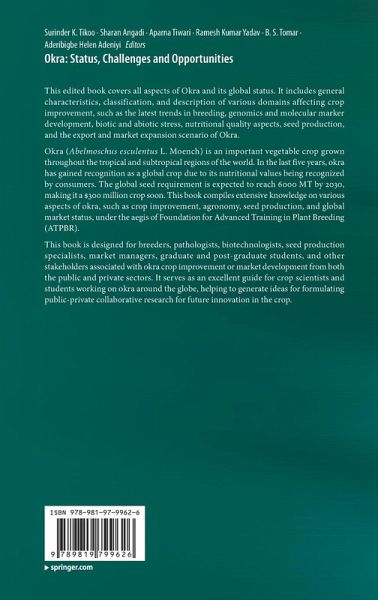 This edited book covers all aspects of Okra and its global status. It includes general characteristics, classification, and description of various domains affecting crop improvement, such as the latest trends in breeding, genomics and molecular marker development, biotic and abiotic stress, nutritional quality aspects, seed production, and the export and market expansion scenario of Okra.