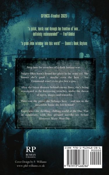 **SFINCS Finalist 2025** "a quick, harsh read through the frontline of war...definitely recommended!" - Bill Adams, FanFiAddict "a great little window into this world" - Jen, Queen's Book Asylum Step into the trenches of a dark fantasy war... Sniper Oksy hasn't found her place in the army yet. She knows she's good - maybe even the best - but Command won't even give her a gun... How can she prove she belongs here - and not in the miserable home she left behind? Experience the thrilling, chilling world of the One War in miniature, with this prequel novella set before However Many Must Die.
